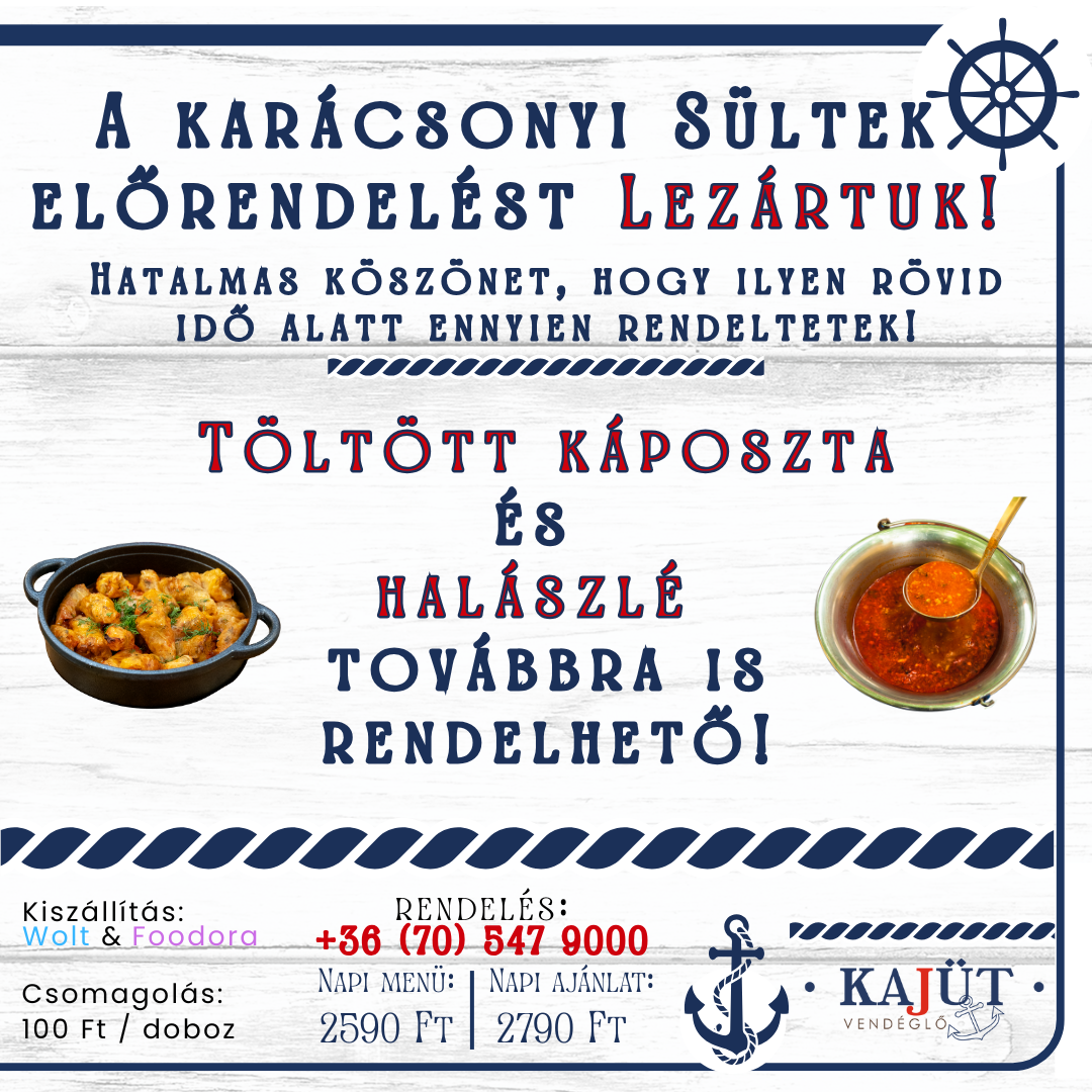 Fontos! A rendeléseket a Kajüt vendéglőből vesszük fel, ezért nyitvatartási időn kívül a hívásokra nem tudjuk válaszolni, mert a céges telefon benn marad a vendéglőben.